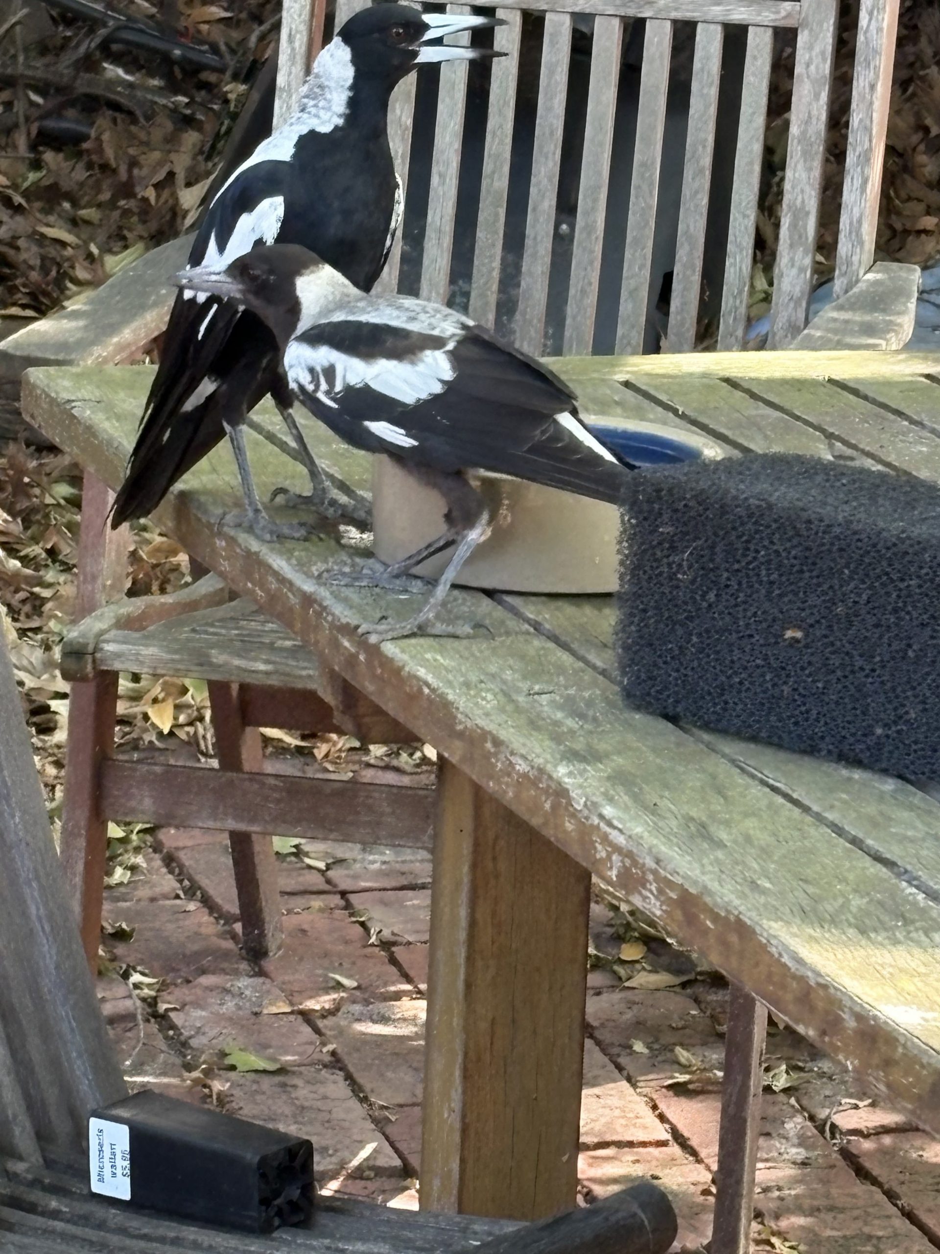I worried for the birds in the extreme heat. On the last day of extreme heat, I found three magpies in my back yard near the outside table squawking, the young one, the one with grey flecked feathers and slightly smaller than the black and white birds I assumed were parents. I offered them water in a low lidded bowl on the table and moved away.