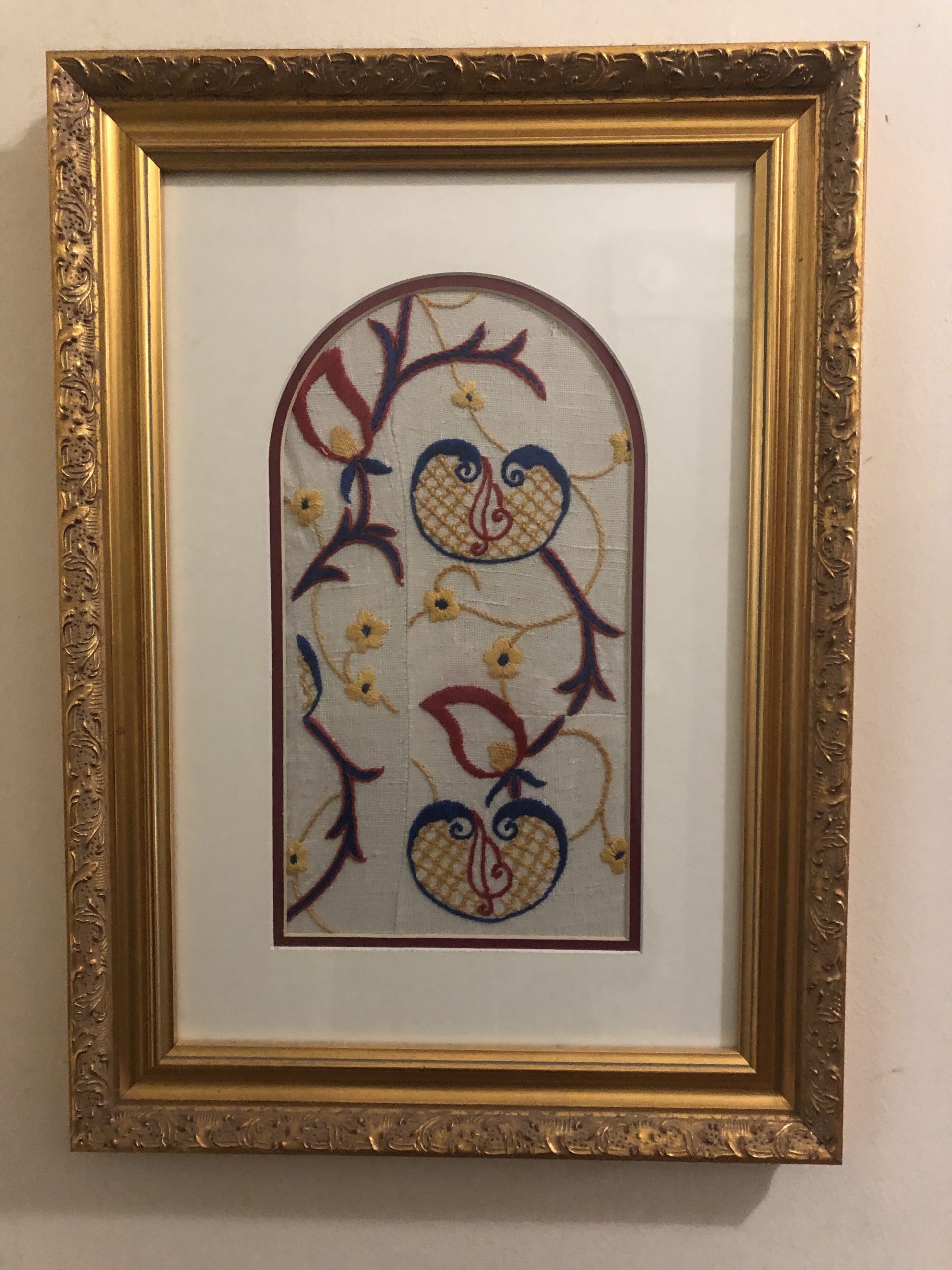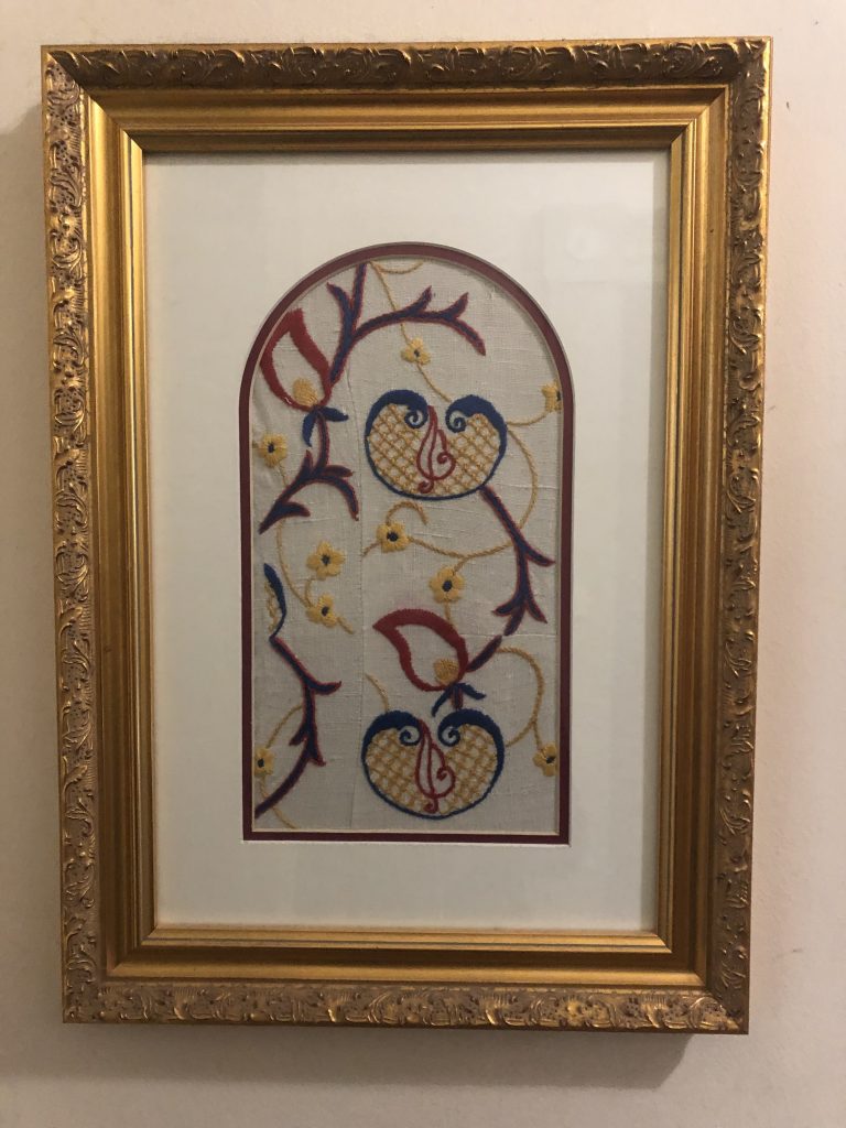 So, my sister formed a plan to find a way of commemorating our mother through her blouse. She cut out sections of the material, large pieces that held together without stains or gashes, and these she framed into a series of pictures, each gold rimmed, each carrying the imprint of the years. Today they hang in our various houses.