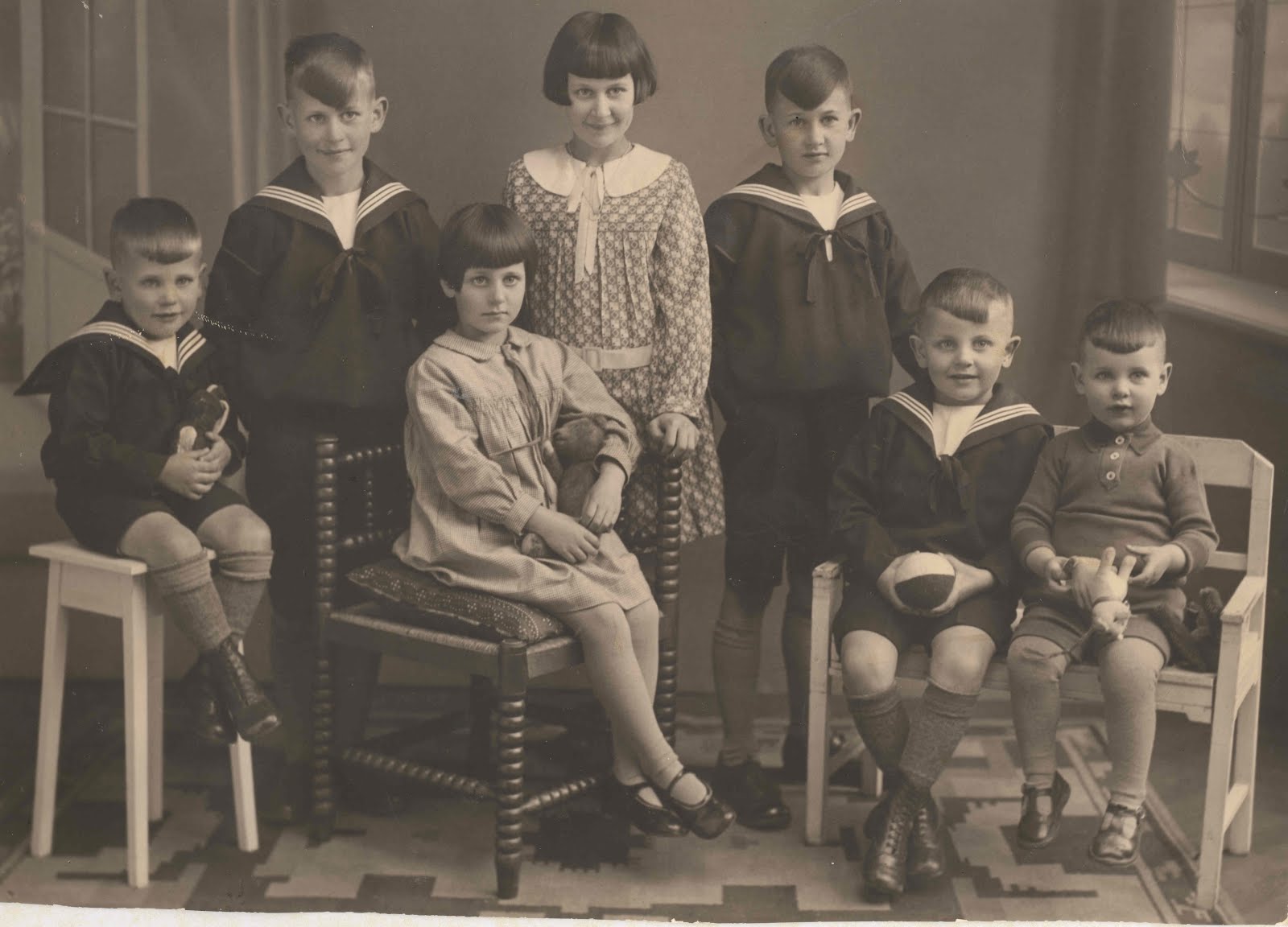 My mother’s family circa 1932. She and her younger sister are the only girls.