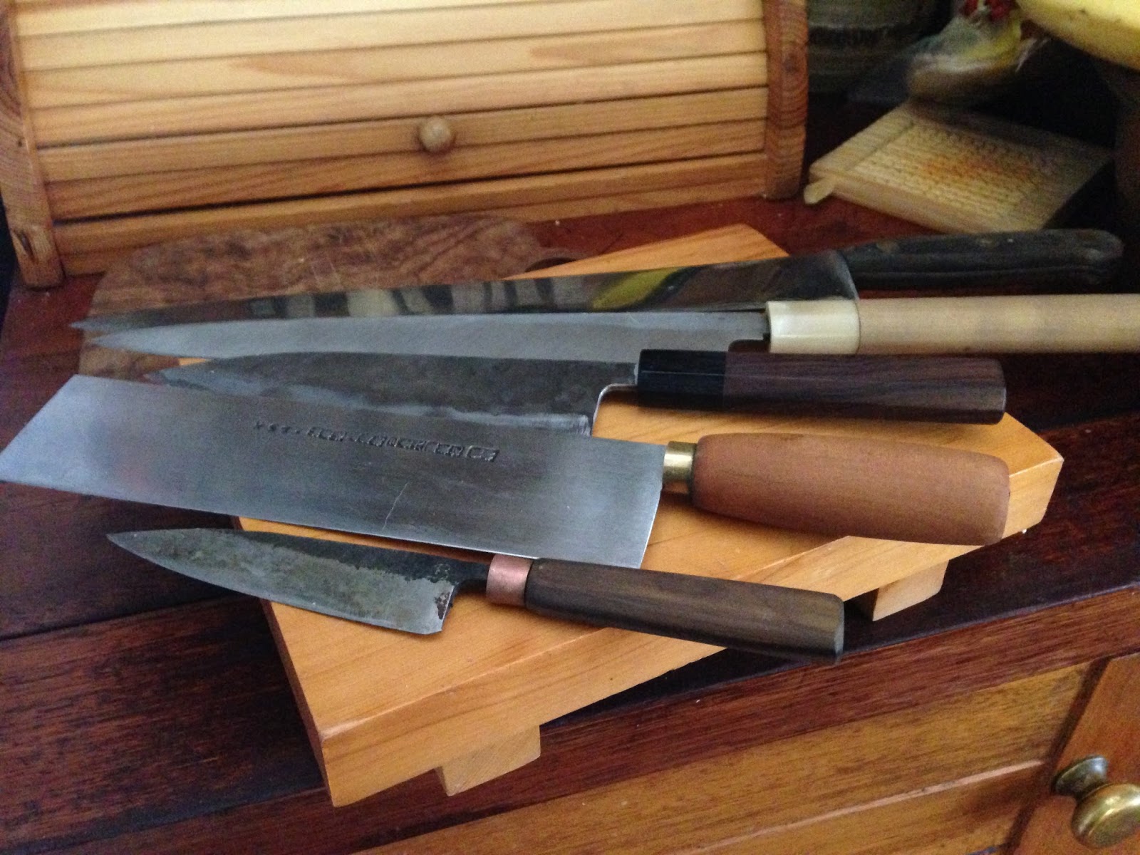I do not understand my husband’s passion for knives other than the passion of one who likes to collect things. Who likes to have in his possession an example of every variety of knife available: cooks knives, paring knives, fish knives, bread knives, Japanese and German knives, pocket knives and cleavers.
